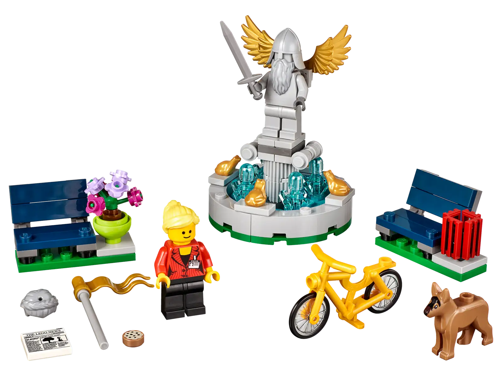 - The set features a buildable model of a fountain including customizable silver-colored statue with gold-colored wings, gold-colored decoration and translucent water-style elements, plus a park bench with a flowerpot and second park bench with a litter bin.