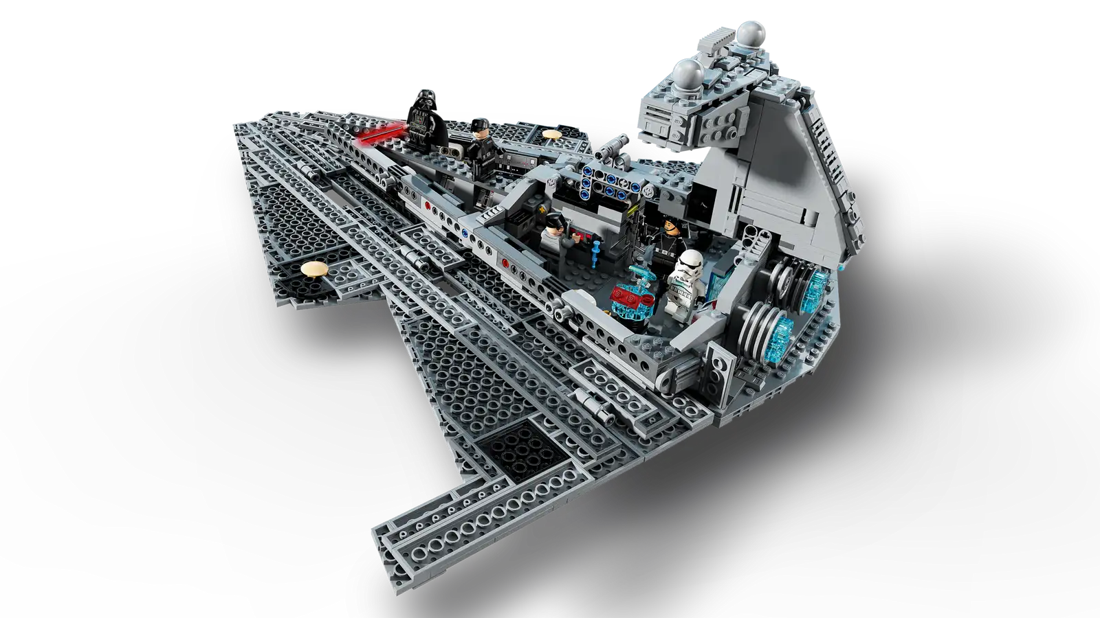 - Creative building playset – The interior features the bridge, command room, break room, armory, control panels, cargo box with Kyber Crystal and thermal detonator elements
